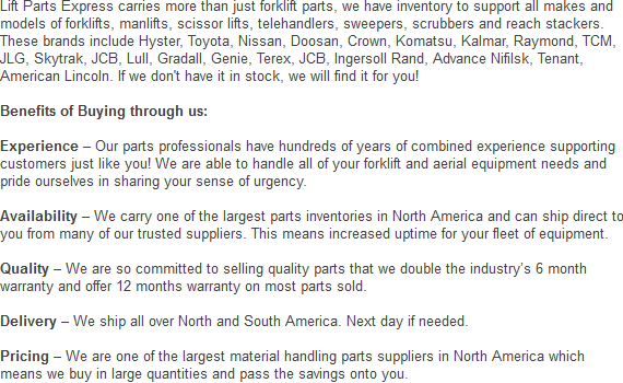 For your entire fleet of lift-trucks, we offer the best prices on all our parts. Call now to get a quote on one of the parts or attachments we offer. Call us at: